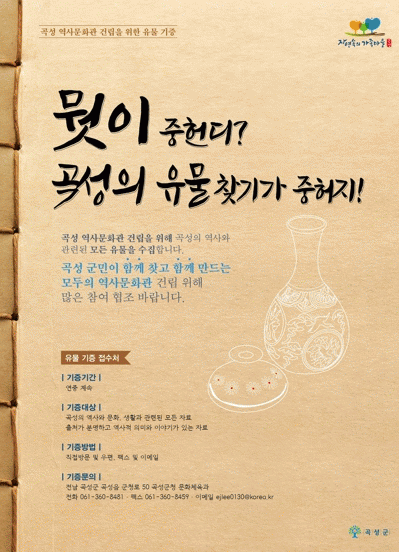 À¯¹° Á¢¼ö ±â°£Àº ±Ý³â 9¿ù 6ÀϺÎÅÍ 12¿ù 31ÀϱîÁö´Ù. ±âÁõÀ» ÇÏ·Á¸é ¸ÕÀú °î¼º±º ¹®ÈüÀ°°ú ¹®ÈÀç°ü¸®ÆÀ¿¡ ±âÁõ ¹× ±âŹ ½Åû¼¸¦ Á¦ÃâÇÏ¸é µÈ´Ù.
