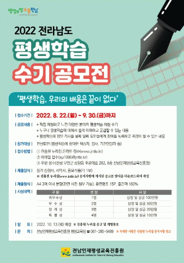 À̹ø °ø¸ðÀüÀº Æò»ýÇнÀ¿¡ Âü¿©ÇÑ Àü³²µµ¹ÎÀ̶ó¸é ´©±¸³ª Âü°¡ÇÒ ¼ö ÀÖ´Ù. Á¢¼ö´Â 9¿ù 30ÀϱîÁö·Î ÀÎÆò¿ø ´©¸®Áý°ú À̸ÞÀÏ ¶Ç´Â ¿ìÆíÀ¸·Î ÇÏ¸é µÈ´Ù.