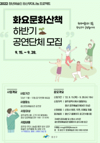 °ø¸ð ºÐ¾ß´Â ¿¬±Ø¡¤À½¾Ç¡¤¹«¿ë µî °ø¿¬¿¹¼ú ºÐ¾ß°í, ±¤ÁÖ¿¡¼ Ȱµ¿ÇÏ´Â 20~30´ë û³â¿¹¼ú´Üü(4ÀÎ ÀÌ»ó)ÀÌ¸é ´©±¸³ª ½ÅûÇÒ ¼ö ÀÖ´Ù. ¼±Á¤ ´Üü´Â °ø¿¬Àå ¹«·á ´ë°ü°ú ÇÔ²² °ø¿¬·á Áö±Þ, Æ÷½ºÅÍ Á¦ÀÛ, È«º¸ ¿µ»ó ÄÜÅÙÃ÷ Áö¿ø, ¹®¿¹È¸°ü ºÎ´ë½Ã¼³ ÀÌ¿ë µîÀÇ ÇýÅÃÀ» ¹Þ´Â´Ù.