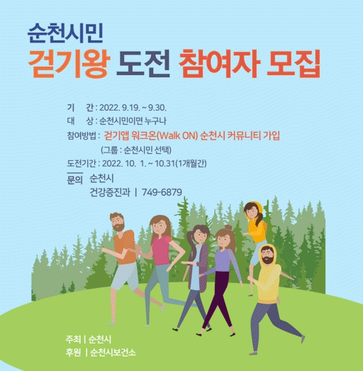 ÇÑÆí, ¿öÅ©¿Â(Walk ON)¿¡´Â ¼øÃµ½Ã¹Î 9340¸íÀÌ °¡ÀÔÇØ ÀÖ´Ù. ¸Å¿ù 1ȸ 1ÀÏ ¸¸º¸ °È±â 縰Áö¸¦ ÁøÇàÇϰí ÀÖÀ¸¸ç ¿À´Â 21ÀϺÎÅÍ 10Àϰ£ 10´ë °È±â Ȱ¼ºÈ¸¦ À§ÇÑ Ã»¼Ò³â °È±â ¹èƲÀ» ÁøÇàÇÒ °èȹÀÌ´Ù.