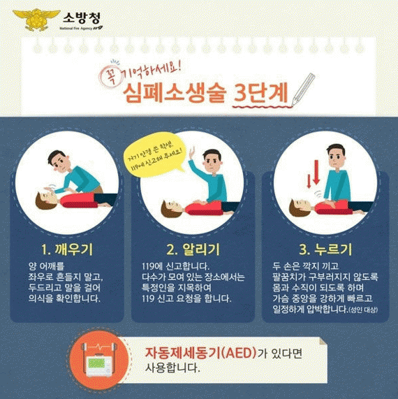 ½ÉÆó¼Ò»ý¼úÀº 1´Ü°è ½ÉÁ¤Áö ȯÀÚ ¹ÝÀÀ È®ÀÎÇϱâ, 2´Ü°è 119 ½Å°í ¹× µµ¿ò ¿äûÇϱâ, 3´Ü°è °¡½¿ ¾Ð¹ÚÇϱ⠼øÀ¸·Î ³ª´ ¼ö ÀÖÀ¸¸ç, ´Ü°èº°·Î ±â¾ïÇØµÎ¸é À§±Þ »óȲ ½Ã ´çȲÇÏÁö ¾Ê°í ½ÉÆó¼Ò»ý¼úÀ» ÇÒ ¼ö ÀÖ´Ù.