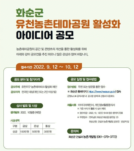 °ø¸ð ±â°£Àº 10¿ù 12ÀϱîÁö¸ç, À¯Ãµ ³óÃÌ Å׸¶°ø¿ø°ú Áö¿ª Ư¼º¿¡ ÀûÇÕÇÑ °ø°£ ±¸¼º¡¤ÄÜÅÙÃ÷¿¡ °ü·ÃÇÑ ³»¿ëÀÌ¸é ´©±¸³ª Âü¿©ÇÒ ¼ö ÀÖ´Ù.