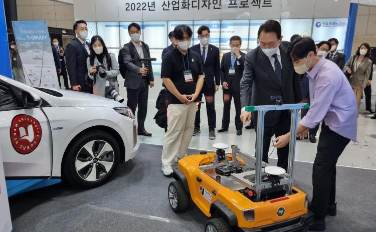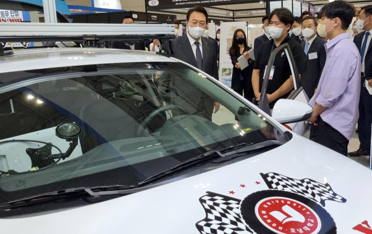 [ÅåÅå´º½º]À±¼®¿ ´ëÅë·ÉÀÌ 9¿ù 28ÀÏ ±è´ëÁß ÄÁº¥¼Ç¼¾ÅÍ¿¡¼ °³¸·µÈ ¡®AI Tech+ 2022¡¯¿¡ Âü°¡Çϰí Àִ ȣ³²´ëÇб³(ÃÑÀå ¹Ú»óö) AIÀÚÀ²ÁÖÇà Àü±âÂ÷ È«º¸°üÀ» ¹æ¹®ÇØ Âü¿© Çлýµé¿¡°Ô ¹Ì·¡ÀÚµ¿Â÷¿¡ ´ëÇÑ ÇöȲ µîÀ» ûÃëÇÏ°í °Ý·ÁÇß´Ù.