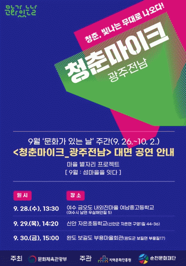 À̹ø ¡®¹®È°¡ ÀÖ´Â ³¯ ûÃḶÀÌÅ©_±¤ÁÖÀü³²¡¯Àº 29ÀÏ 14½Ã 20ºÐ ½Å¾È±º ÀÚÀºµµ ÀÚÀºÃʵîÇб³ °´ç¿¡¼ 7ÆÀ, 30ÀÏ 15½Ã ¿Ïµµ±º º¸±æµµ ºÎ¿ë¸¶À»È¸°ü¿¡¼ 5ÆÀÀÇ Ã»³â ¿¹¼ú°¡µéÀÌ °ø¿¬À» ÆîÄ£´Ù.