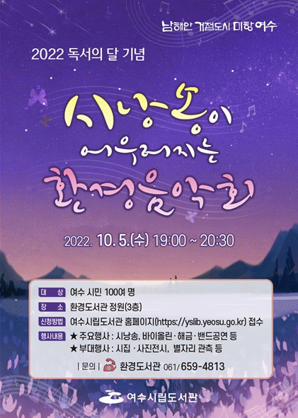 ÀÚ¼¼ÇÑ ³»¿ë ¹× Á¢¼ö ¹æ¹ýÀº ¿©¼ö½Ã¸³µµ¼°ü ȨÆäÀÌÁö °øÁö»çÇ×À» È®ÀÎÇϰųª, ȯ°æµµ¼°üÀ¸·Î ¹®ÀÇÇÏ¸é µÈ´Ù.