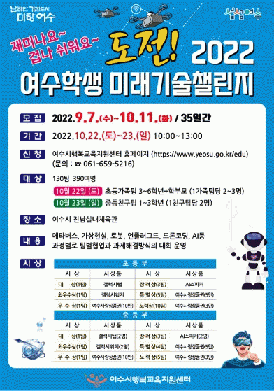 Âü°¡ ½ÅûÀº ¿À´Â 11ÀϱîÁö ¿©¼ö½ÃÇູ±³À°Áö¿ø¼¾ÅÍ È¨ÆäÀÌÁö¿¡¼ °¡´ÉÇϸç, ÃʵîÇлý 3~6Çгâ°ú Çкθð 縰Áö(10. 22.)´Â 80°³ ÆÀ, ÁßÇлý 縰Áö(10. 23.)´Â 50°³ ÆÀÀ» °¢°¢ ¸ðÁýÇÑ´Ù.