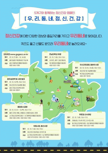 ±¤Áֽð¡ ÁÖÃÖÇÏ°í ±¤ÁÖ±¤¿ªÁ¤½Å°Ç°º¹Áö¼¾ÅÍ, 5°³±¸ Á¤½Å°Ç°º¹Áö¼¾ÅÍ, 5°³±¸ Áßµ¶°ü¸®ÅëÇÕÁö¿ø¼¾ÅͰ¡ °øµ¿À¸·Î ÁÖ°üÇÏ´Â À̹ø Çà»ç´Â ¡®ÀÌÁ¦´Â ¸¶À½¿¡ ÅõÀÚÇϼ¼¿ä¡¯¶ó´Â ÁÖÁ¦·Î, Á¤½Å°Ç° È«º¸ÁÖ°£ÁøÇàµÇ¸ç, ¿Â¡¤¿ÀÇÁ¶óÀο¡¼ µ¿½Ã¿¡ Âü¿©ÇÒ ¼ö ÀÖ´Ù.