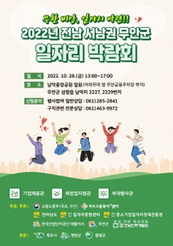 À̹ø ¹Ú¶÷ȸ´Â °í¿ë³ëµ¿ºÎ ¸ñÆ÷¡¤¹«¾È°í¿ëº¹ÁöÇ÷¯½º¼¾ÅÍ, Àü¶ó³²µµ, Àü¶ó³²µµ Áß¼Ò±â¾÷ÀÏÀÚ¸®°æÁ¦ÁøÈï¿ø, Àü¶ó³²µµ ÀÏÀÚ¸®Á¾ÇÕ¼¾ÅÍ, Çѱ¹»ê¾÷´ÜÁö°ø´Ü ´ëºÒÁö»ç°¡ °øµ¿ ÁÖ°üÇÏ°í ¹«¾È±ºÀÌ ÁÖÃÖÇÏ¸ç ¸ñÆ÷½Ã, ¿µ¾Ï±º, ÇÔÆò±ºÀÇ ÈÄ¿øÀ¸·Î ¼³²±Ç Àüü °í¿ë½ÃÀåÀ» ¾Æ¿ì¸¥´Ù.