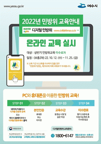 ±³À° ´ë»óÀº ¿©¼ö½Ã¿¡ ÁÖ¼ÒÁö¸¦ µÐ ¸¸ 20¼¼¿¡¼ ¸¸ 40¼¼±îÁö ¹Î¹æÀ§´ë¿ø Áß »ó¹Ý±â ±âº»±³À°À̳ª »çÀ̹ö 1Â÷ ±³À°À» ¹ÞÁö ¾ÊÀº ¹Ì À̼öÀÚÀÌ´Ù.