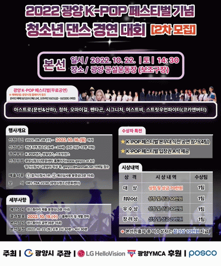 ±¤¾ç½Ã°¡ ÁÖÃÖÇϰí LGÇï·ÎºñÀü°ú ±¤¾ç YMCA°¡ ÁÖ°üÇÏ´Â À̹ø °æ¿¬´ëȸ´Â ¡®2022 ±¤¾ç K-POP Æä½ºÆ¼¹ú¡¯À» ±â³äÇϰí Àڶ󳪴 û¼Ò³âµé¿¡°Ô ´Ù¾çÇÑ ±âȸ¸¦ ¿¾îÁÖ±â À§ÇØ ¸¶·ÃµÆ´Ù.