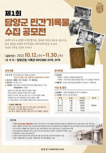 À̹ø °ø¸ðÀüÀº ¡®´ç½ÅÀÇ ¼ÒÁßÇÑ ±â·Ï, ´ã¾ç¿ª»ç ÇÑ ÆäÀÌÁö¿¡ ±â¾ïµÇ´Ù¡¯¸¦ ÁÖÁ¦·Î ´ã¾çÀÇ º¯Ãµ°ú »ýȰ»ó µî °ú°ÅÀÇ ´Ù¾çÇÑ ¸ð½ÀÀÌ ´ã±ä ¹Î°£±â·Ï¹°À» ¼öÁý¡¤º¸Á¸ÇØ ´ã¾çÀÇ ¿ª»ç¿Í À̾߱⸦ ¹Ì·¡¼¼´ë¿¡ Àü´ÞÇϰíÀÚ ±âȹµÆ´Ù.