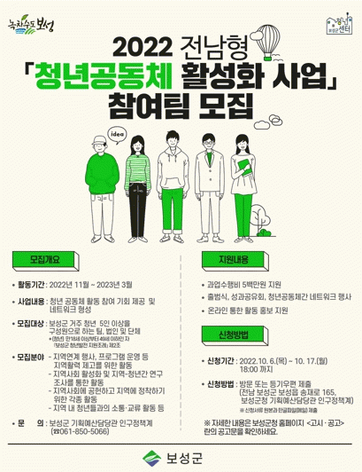 Áö¿ø ÀÚ°ÝÀº º¸¼º±º¿¡ °ÅÁÖÇϰí ÀÖ´Â 5ÀÎ ÀÌ»óÀÇ Ã»³â°øµ¿Ã¼·Î ¸ðÁý ±â°£Àº 2022³â 10¿ù 6ÀϺÎÅÍ 10¿ù 17ÀϱîÁö´Ù. »ç¾÷´ë»óÀÚ·Î ¼±Á¤µÇ¸é ¿À´Â 11¿ùºÎÅÍ ³»³â 3¿ù±îÁö 5°³¿ù°£ Ȱµ¿ÇÏ°Ô µÈ´Ù.