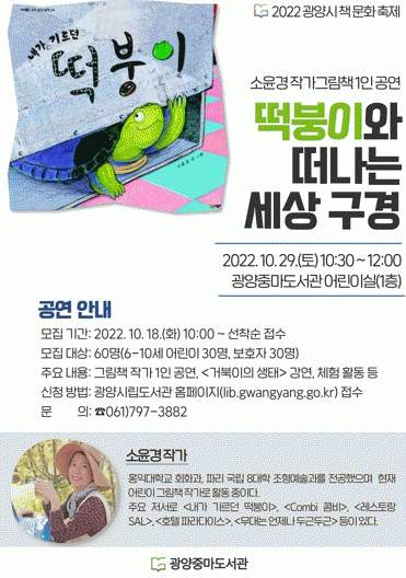 ÇÑÆí, 10¿ù 29ÀÏ ±¤¾çÁ߸¶µµ¼°ü ÀÏ¿ø¿¡¼ ÁøÇàÇÏ´Â ¡®2022 ±¤¾ç½Ã Ã¥ ¹®ÈÃàÁ¦¡¯´Â °¼öµ¹ °í·Á´ë ¸í¿¹±³¼ö Ư°, ¾î¸°ÀÌ »ó»óÈ ±×¸®±â °æ¿¬´ëȸ, ÇØ¼³ÀÌ ÀÖ´Â Ä«Æä ÄܼƮ¿Í ´Ù¾çÇÑ Ã¼Çè ºÎ½º µî ´Ù¾çÇÑ ¹®ÈÇà»ç·Î ½Ã¹Î°úÀÇ ¸¸³²À» ÁغñÇϰí ÀÖ´Ù.