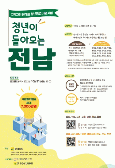 ¡®Áö¿ªÀÚ¿ø ¿¬°èÇü û³ââ¾÷ Áö¿ø»ç¾÷¡¯Àº Àü¶ó³²µµ ³» 16°³ ½Ã±ºÀÌ ÇÔ²² û³ââ¾÷°¡¸¦ ¹ß±¼ÇØ Áö¿ªÀÚ¿øÁ¶»ç Ȱµ¿, »ç¾÷È °úÁ¤, ¸àÅ丵, â¾÷ ±³À°°ú Æò°¡ °á°ú¿¡ µû¶ó ÃÖ¼Ò 100¸¸¿ø~ÃÖ´ë 7,100¸¸¿øÀÇ Áö¿ø±ÝÀ» Â÷µî Áö¿øÇÏ´Â »ç¾÷ÀÌ´Ù. ´ã¾ç±ºÀº 7ÆÀÀ» Áö¿øÇÑ´Ù.