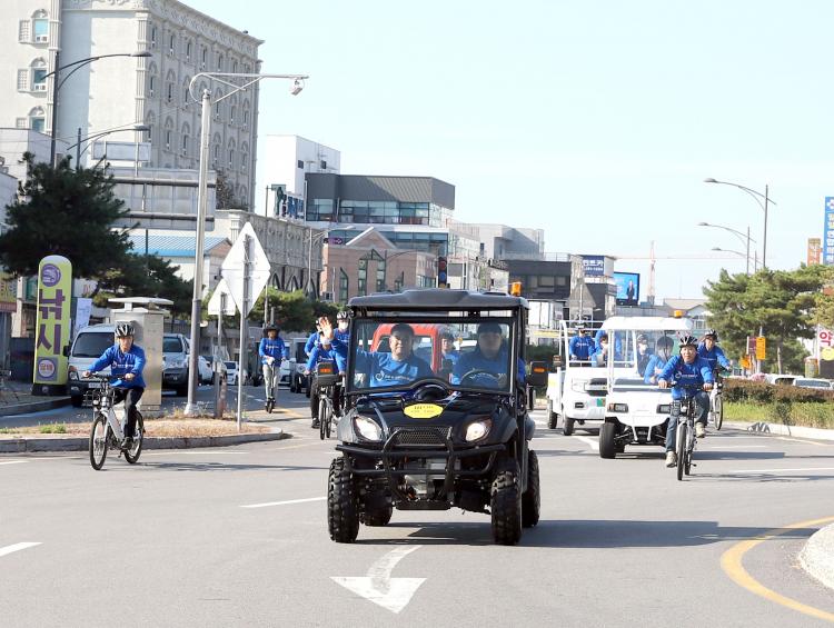 e-¸ðºô¸®Æ¼ ÆÛ·¹À̵å´Â °Á¾¸¸ ¿µ±¤±º¼ö°¡ ž½ÂÇÑ ³ó¾÷¿ë Àüµ¿Â÷¸¦ ÇʵηΠ°ü³»¿¡¼ »ý»êÇÑ ³ó¾÷¿ë Àüµ¿Â÷, ÃʼÒÇü ½ÇÁõ Â÷·®ÀÌ µÚ¸¦ ÀÌ·ç¾ú°í, Àü±¹ÀÇ ´ëÇлýµéÀÌ Á÷Á¢ Á¦ÀÛÇÑ Àü±âÂ÷·Î ±¸¼ºµÈ Çà·Ä·Î ¿µ±¤À¾ ½Ã°¡Áö 2km¸¦ ÇàÁøÇÏ¿© Àå°üÀ» ÀÌ·ç¾ú´Ù.