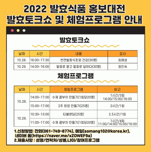 ¡®2022 Àü±¹ ¹ßÈ¿½Äǰ È«º¸´ëÀü¡¯ ¹× üÇè ÇÁ·Î±×·¥ Âü°¡ ½Åû¿¡ ´ëÇÑ ÀÚ¼¼ÇÑ ³»¿ëÀº ¼øÃµ½Ã ´©¸®Áý°ú ºí·Î±× µî SNS °èÁ¤¿¡¼ È®ÀÎÇÏ¸é µÈ´Ù.