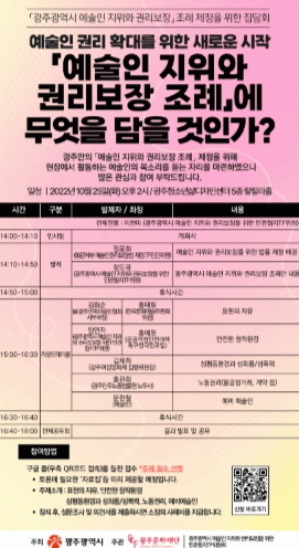 ±¤Áֽð¡ ÁÖÃÖÇÏ°í ±¤ÁÖ¹®ÈÀç´ÜÀÌ ÁÖ°üÇÏ´Â À̹ø Áý´ãȸ´Â ÇöÀå¿¡¼ Ȱµ¿ÇÏ´Â ¿¹¼úÀÎÀÇ ÀǰßÀ» ûÃëÇϰí Áö¿ª ½ÇÁ¤¿¡ ¸Â´Â ½ÇÁúÀûÀÎ ¿¹¼úÀÎ ÁöÀ§¿Í ±Ç¸®º¸Àå Á¤Ã¥ ¹æ¾ÈÀ» ã±â À§ÇØ ¸¶·ÃµÆ´Ù.