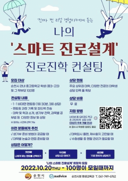 ¡®³ªÀÇ ½º¸¶Æ® Áø·Î¼³°è¡¯´Â ¼øÃµ½Ã ³» ÁßÇб³ 3ÇгâºÎÅÍ °íµîÇб³ 3Çгâ±îÁö Çлý°ú Çкθ𸦠´ë»óÀ¸·Î ÇÏ¸ç ¼±Âø¼øÀ¸·Î 100¸íÀ» ¼±¹ßÇØ ¿Ã ¿¬¸»±îÁö ¿Â¶óÀÎ ¸àÅ丵À» ¹«·á·Î Á¦°øÇÑ´Ù.