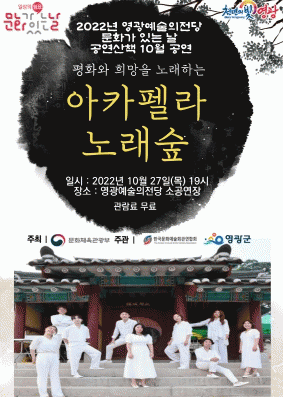 Çѱ¹¹®È¿¹¼ú¿¬ÇÕȸ¿¡¼ Áö¿øÇÏ´Â 2022³â Áö¿ª¹®È¿¹¼úȸ°ü ¹®È°¡ ÀÖ´Â ³¯ °ø¸ð»ç¾÷¿¡ ¼±Á¤µÈ À̹ø °ø¿¬Àº ¹®ÈüÀ°°ü±¤ºÎ¿¡¼ ÁÖÃÖ Çϰí Çѱ¹¹®È¿¹¼úȸ°ü¿¬ÇÕȸ¿Í ¿µ±¤±º¿¡¼ ÁÖ°üÇÑ´Ù.