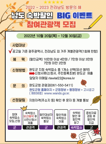 ¡®2022~2023 Àü¶ó³²µµ ¹æ¹®ÀÇ ÇØ¡¯¸¦ ¸Â¾Æ ÁøÇàµÇ´Â À̹ø À̺¥Æ®´Â ¿À´Â 12¿ù 30ÀϱîÁö ¼÷¹Úºñ À̺¥Æ® ½Åû¼¸¦ ±º¿¡ Á¦ÃâÇÑ ÈÄ ÁöÁ¤µÈ ¼÷¹Ú¾÷¼Ò¸¦ ÀÌ¿ëÇÏ¸é ¼÷¹Úºñ ÀϺθ¦ ÇÒÀÎ¹Þ°Ô µÈ´Ù.