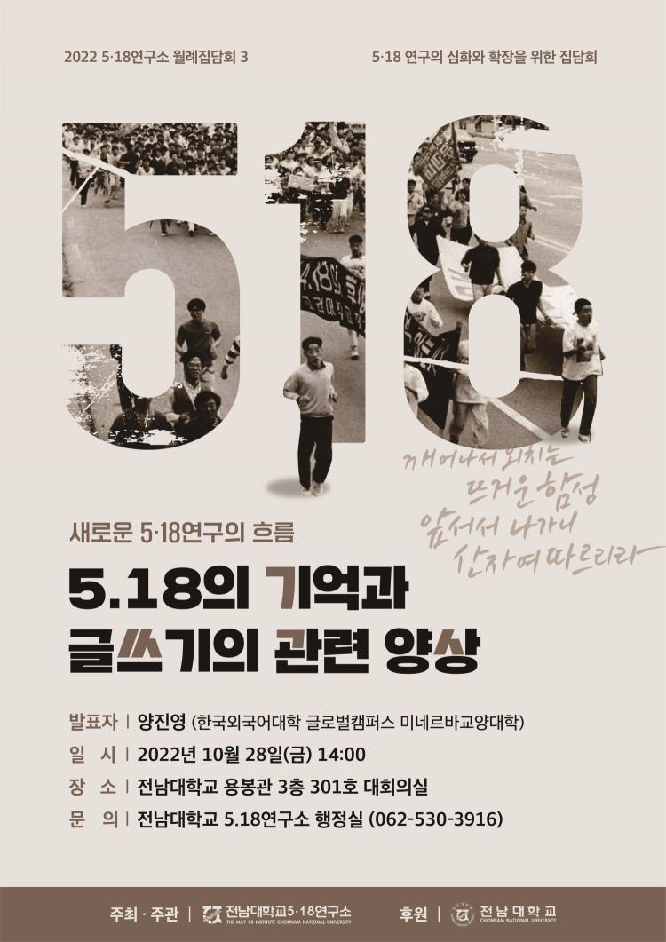 Àü³²´ë 5‧18¿¬±¸¼Ò(¼ÒÀå ÃÖÁ¤±â¡¤»çȸÇаú ±³¼ö)´Â À̹ø Áý´ãȸ¿¡ Çѱ¹¿Ü±¹¾î´ë ¹Ì³×¸£¹Ù±³¾ç´ëÇп¡ Ãâ° ÁßÀÎ ¾çÁø¿µ ±³¼ö¸¦ ÃÊÃ»ÇØ Áö±Ý±îÁö 5‧18¹ÎÁÖȿ°ú °ü·ÃÇÑ ±Û¾²±â ¾ç»óÀ» »ìÆìº¸°í, 5‧18¹®ÇÐÅØ½ºÆ® ¾ÆÄ«À̺ùÀÇ Çʿ伺 ¹®Á¦¸¦ Á¦±âÇÏ´Â ±âȸ·Î »ï´Â´Ù.