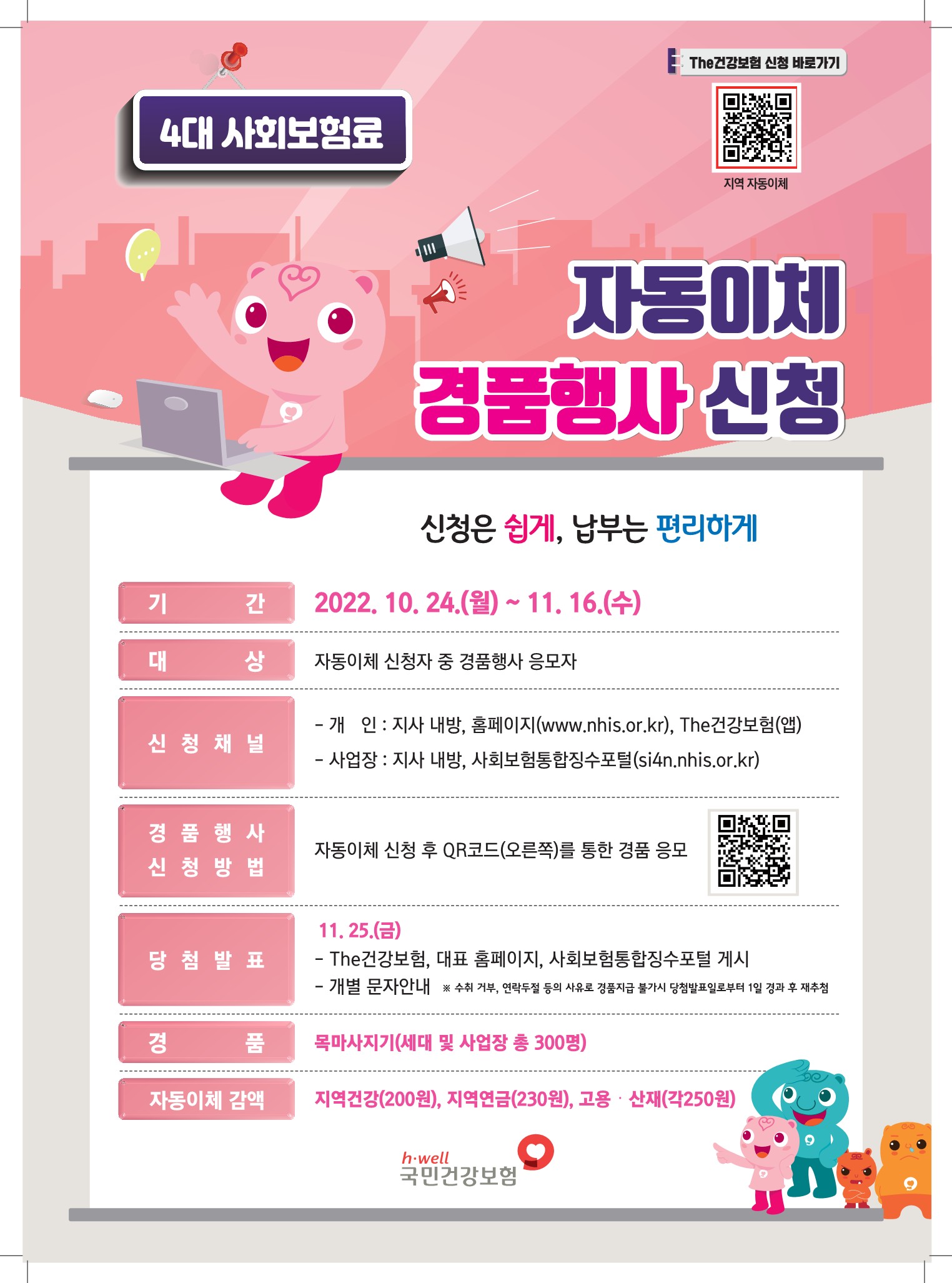4´ë »çȸº¸Çè ÀÚµ¿ÀÌü ½Åû¹æ¹ýÀº Áö¿ª°¡ÀÔÀÚ´Â Æ÷½ºÅÍ¿¡ ³ª¿Í ÀÖ´Â QRÄڵ带 ÅëÇØ °ø´ÜÀÇ ¸ð¹ÙÀϾÛÀÎ The°Ç°º¸Çè ½Åû¼·Î ¿¬°áÇÏ¿© °øµ¿ÀÎÁõ¼³ª ±ÝÀ¶ÀÎÁõ¼·Î ·Î±×ÀÎ ÈÄ ¹Ù·Î ½Åû°¡´ÉÇϸç, »ç¾÷ÀåÀº »çȸº¸ÇèÅëÇÕ¡¼öÆ÷ÅÐ(si4n.nhis.or.kr)À̳ª EDI¿¡¼ ¿Â¶óÀÎ ½ÅûÀÌ °¡´ÉÇÏ´Ù.