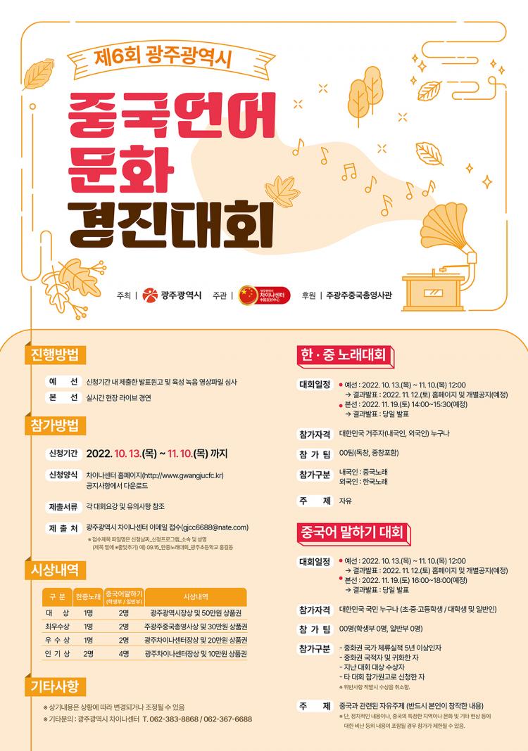 ±¤ÁÖ-Áß±¹ÀÇ ¿ìÈ£±³·ù ÁõÁø°ú ±Û·Î¹ú ÀÎÀç À°¼ºÀ» À§ÇØ ¸¶·ÃµÇ´Â ¡®±¤ÁÖ±¤¿ª½Ã Áß±¹¾ð¾î¹®È °æÁø´ëȸ¡¯´Â Àü±¹ ÃÊ¡¤Áß¡¤°í, ´ëÇлý°ú ¼ºÀÎÀ» ´ë»óÀ¸·Î ÇÏ´Â Áß±¹¾î ¸»Çϱ⠴ëȸ¿Í, ´ëÇѹα¹ °ÅÁÖ ¿Ü±¹Àΰú ´ëÇѹα¹ ´©±¸³ª Âü°¡ÇÒ ¼ö ÀÖ´Â ÇÑ¡¤Áß ³ë·¡ °æ¿¬ ´ëȸ·Î ³ª´µ¾î ÁøÇàµÈ´Ù.