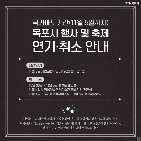 ½Ã´Â Á¤ºÎ°¡ ¿À´Â 5ÀϱîÁö¸¦ ±¹°¡¾Öµµ±â°£À¸·Î ÁöÁ¤ÇÔ¿¡ µû¶ó ÅëÀåÇѸ¶À½¾î¿ï¸²´ëȸ¡¤¸ñÆ÷ÇØ»ó¼î(ÀÌ»ó 11¿ù 5ÀÏ), ºÎÈﵿ ¾î¿ï¸¶´çÃàÁ¦(11¿ù 4ÀÏ) µîµµ ¿¬±â ¶Ç´Â Ãë¼ÒÇß´Ù.