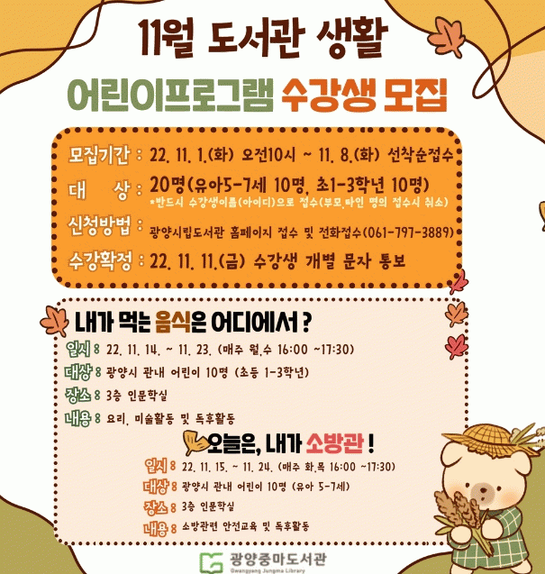 11¿ù µµ¼°ü »ýȰ ¾î¸°ÀÌ ÇÁ·Î±×·¥ ¼ö° ½ÅûÀº 11¿ù 1ÀÏ~11¿ù 8ÀÏ 18½Ã ±¤¾ç ½Ã¸³µµ¼°ü ȨÆäÀÌÁö¸¦ ÅëÇØ °¡´ÉÇϸç, ¹Ýµå½Ã ¼ö°»ý À̸§(¾ÆÀ̵ð)À¸·Î ½ÅÃ»ÇØ¾ß ÇÑ´Ù.