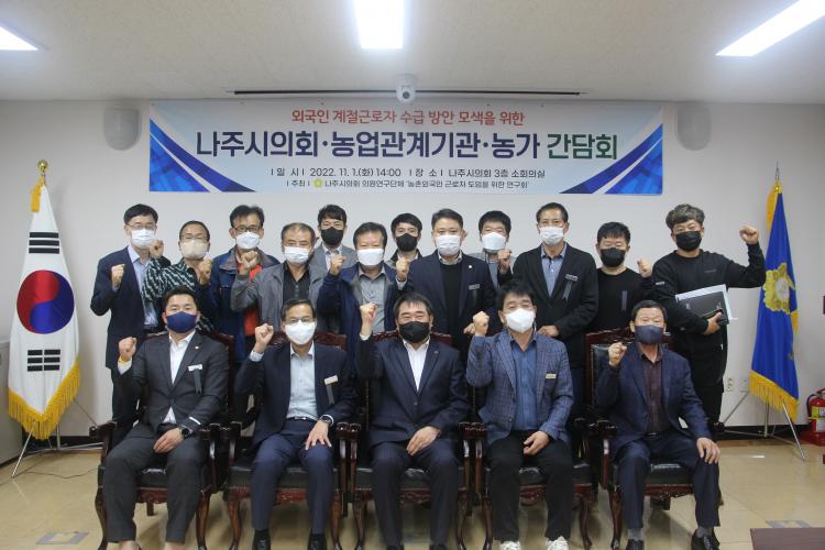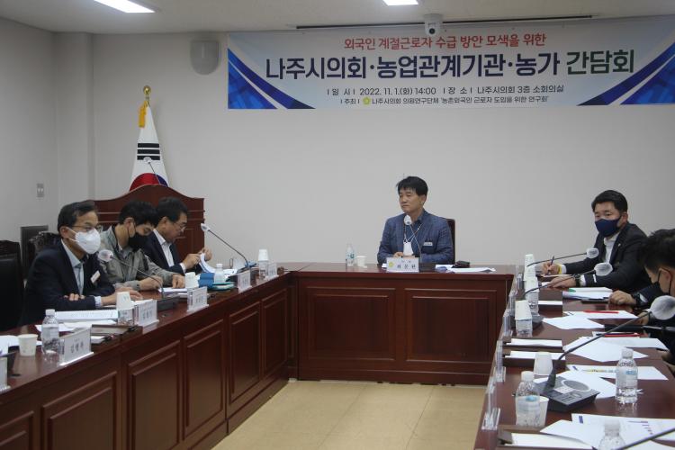 ³ªÁÖ½ÃÀÇȸ ¼ÒȸÀǽǿ¡¼ ¿¸° ÀÌ ³¯ °£´ãȸ¿¡´Â ³ªÁÖ½ÃÀÇȸ ÀÌ»ó¸¸ ÀÇÀåÀ» ºñ·ÔÇÑ ³ó±Ù¿¬ ¼Ò¼Ó ÀÇ¿øµé°ú, ³ªÁÖ¹è¿ø¿¹³óÇù À̵¿Èñ Á¶ÇÕÀå, ³ªÁֽà ³ó¾÷±â¼ú¼¾ÅÍ Á¶¼ºÀº ¼ÒÀå, ³ªÁֹ迬±¸È¸ ±èº´½Ä ȸÀå, ¹è³ó°¡ ¹× ¿Ü±¹ÀÎ Àη °ü¸® °ü°èÀÚ µî 20¿©¸íÀÌ Âü¼®Çß´Ù.