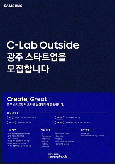 »ï¼ºÀüÀÚ´Â ¡®C-Lab ¾Æ¿ô»çÀÌµå ±¤ÁÖ¡¯¿¡ Âü¿©¸¦ Èñ¸ÁÇϴ â¾÷ÀÚ¸¦ ´ë»óÀ¸·Î 16ÀÏ ½Ãû 2Ãþ ¹«µîȦ¿¡¼ ¿ÀÀü 11~12½Ã, ¿ÀÈÄ 4~5½Ã µî µÎ Â÷·Ê¿¡ °ÉÃÄ »ç¾÷ ¼³¸í°ú ÁúÀÇÀÀ´ä ½Ã°£À» °®´Â´Ù.