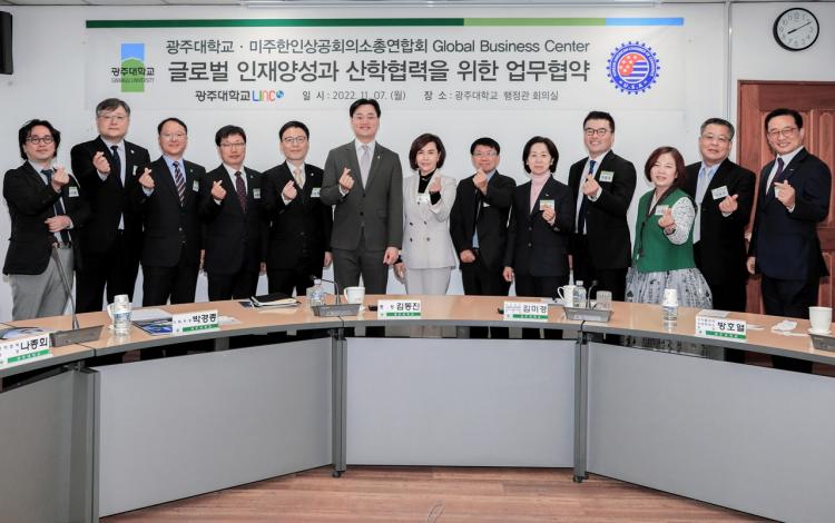 ¡Ø»çÁø¼³¸í : ±èµ¿Áø ±¤ÁÖ´ë ÃÑÀå(¿ÞÂÊ¿¡¼ ¿©¼¸ ¹øÂ°)°ú ±è¹Ì°æ ¹ÌÁÖÇÑÀλó°øÈ¸ÀǼÒÃÑ¿¬ÇÕȸ Global Business Center º»ºÎÀå(¿À¸¥ÂÊ¿¡¼ Àϰö ¹øÂ°) µîÀÌ ¾÷¹«Çù¾à ü°á½ÄÀ» ¸¶Ä¡°í ±â³ä ÃÔ¿µÀ» Çϰí ÀÖ´Ù.