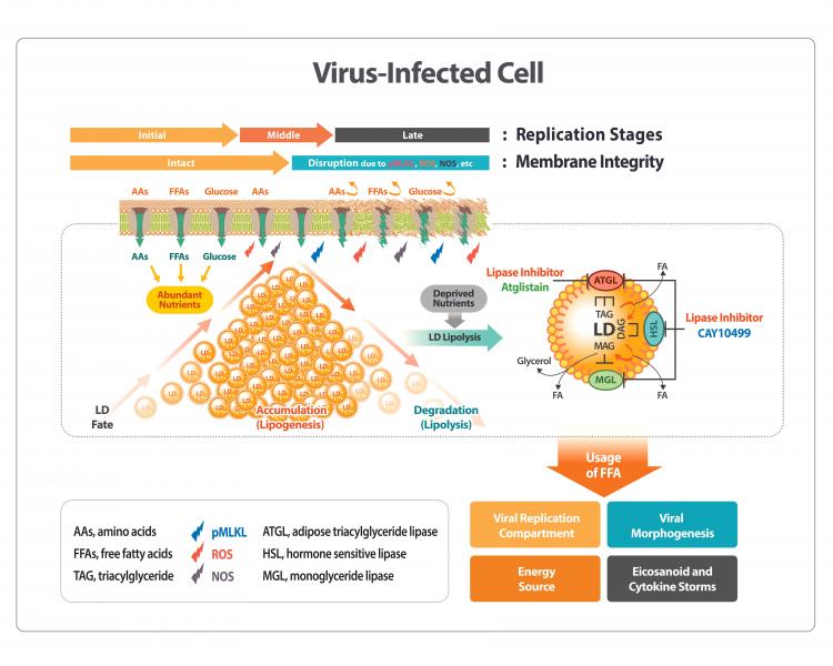 Áï, Äڷγª-19³ª µ¶°¨À» ÀÏÀ¸Å°´Â ´Ù¾çÇÑ RNA ¹ÙÀÌ·¯½ºµéÀº Áö¹æ¹æ¿ï(lipid droplet)À» ¼¼Æ÷ ³»¿¡ ÃàÀûÇß´Ù°¡ °¨¿° ÈıⰡ µÇ¸é À̸¦ Áö¹æºÐÇØÈ¿¼ÒÀÎ ATGL°ú HSL·Î ³ìÀ̴µ¥, À̶§ »ý¼ºµÈ À¯¸®Áö¹æ»êÀ» ÀÌ¿ëÇØ ¹ÙÀÌ·¯½º¸¦ Áõ½ÄÇÑ´Ù´Â »ç½ÇÀ» ±Ô¸íÇØ³»°í, Áö¹æºÐÇØÈ¿¼Ò¸¦ ¾ïÁ¦ÇÏ´Â ¹°ÁúÀ» °³¹ßÇϴµ¥ ÁÖ·ÂÇØ ¿Ô´Ù.