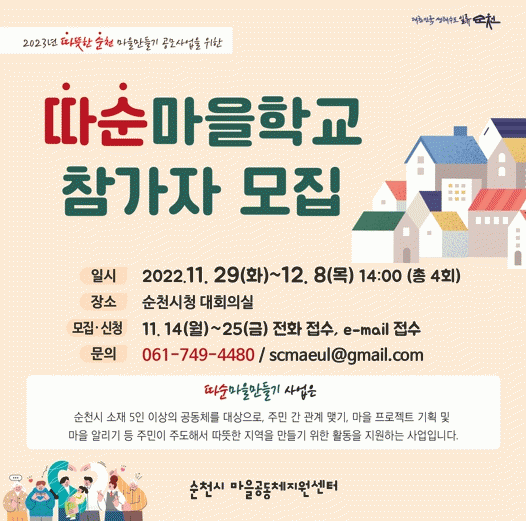 µû¼ø¸¶À»Çб³¿¡ ´ëÇÑ ÀÚ¼¼ÇÑ »çÇ×Àº ¼øÃµ½Ãû ´©¸®ÁýÀÇ °í½Ã/°ø°í °Ô½ÃÆÇÀ» Âü°íÇϰųª, ¼øÃµ½Ã¸¶À»°øµ¿Ã¼Áö¿ø¼¾ÅÍ·Î ¹®ÀÇÇÏ¸é µÈ´Ù.