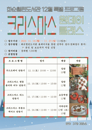 ÀϹÝÀÎ ´ë»óÀ¸·Î ¡®¿ìµåÆ®·¹ÀÌ ¸¸µé±â¡¯¿Í ¡®Äµµé Ȧ´õ ¹× Æ®¸® ¸ð¾ç ºñ´© ¸¸µé±â¡¯, ÃʵîÇлý ´ë»óÀ¸·Î´Â ¡®Å©¸®½º¸¶½º ¸®½º ¸¸µé±â¡¯, °¡Á·ÀÌ ÇÔ²² ÇÒ ¼ö ÀÖ´Â ¡®·çµ¹ÇÁ ÄÉÀÌÅ© ¸¸µé±â¡¯ 4°³ °Á¸¦ ¸ÅÁÖ Åä¿äÀÏ ÃÑ 4ȸ¿¡ °ÉÃÄ ÁøÇàÇÑ´Ù.
