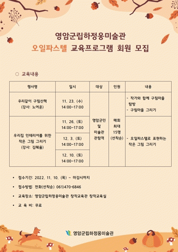 23ÀÏ¿¡´Â ÇöÀç ÇÏÁ¤¿õ¹Ì¼ú°ü¿¡ Àü½ÃÁßÀÎ ³ë¿©¿îÀÛ°¡ÀÇ ¡®¿µ¾Ï»êÃ¥¡¯°ú ¿¬°èÇÏ¿© ÀÛ°¡¿Í ÇÔ²² ±¸¸²¸¶À»À» °°ÀÌ °È°í ÀÛǰ¿¡ ´ëÇÑ ¼³¸íÀ» µéÀ¸¸ç º»ÀÎÀÌ º» ±¸¸²¸¶À»À» ±×·Áº¼ ¼ö ÀÖ´Â ¡®¿ì¸®°°ÀÌ ±¸¸²»êÃ¥¡¯À» ±âȹÇßÀ¸¸ç, 26ÀϺÎÅÍ 3ÁÖ°£Àº ¸ÅÁÖ Åä¿äÀÏ ¿ÀÈÄ ¿ÀÀÏÆÄ½ºÅڷΠǥÇöÇϴ¡®ÀÛÀº ±×¸² ±×¸®±â¡¯·Î ÀÏ»ó ¼ÓÀÇ ¿¹¼úÀ» ¼±»çÇÒ °èȹÀÌ´Ù.