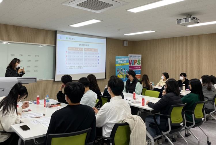 ÃÑ 40¸íÀÇ ÇлýÀÌ Âü¿©ÇßÀ¸¸ç ¼º°ÝÀ¯Çü°Ë»ç(MBTI) °Ë»çÁö ÀÛ¼º ¹× ÇØ¼®, À¯Çü¿¡ µû¸¥ °³ÀÎÀÇ ¼ºÇ⠺м® ¹× À¯Çüº° Á÷¹« ¹× Á÷¾÷±º ¾È³» µîÀÇ ³»¿ëÀ¸·Î ÁøÇàµÆ´Ù.