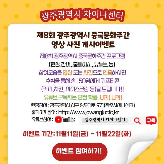 ±¤ÁÖÂ÷À̳ª¼¾ÅÍ ¿µ»ó »çÁø °Ô½Ã À̺¥Æ®¿Í °ü·ÃÇÑ ÀÚ¼¼ÇÑ ³»¿ëÀº Â÷À̳ª¼¾ÅÍ È¨ÆäÀÌÁö(http://gwangjucfc.kr)¸¦ ÅëÇØ È®ÀÎÇÒ ¼ö ÀÖ´Ù.