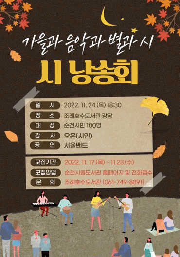 ¼øÃµ½Ã µµ¼°ü °ü°èÀÚ´Â ¡°±í¾î°¡´Â °¡À»¹ã Á¶·ÊÈ£¼öµµ¼°ü¿¡¼ ½Ã¿Í À½¾ÇÀ» ÇÔ²² Á¢ÇÏ°Ô µÉ ½Ã ³¶¼Ûȸ´Â ¼øÃµ½Ã¹Îµé¿¡°Ô ¹®ÈÀû dz¼ºÇÔÀ» ´À³¢°Ô ÇØÁÙ »ö´Ù¸¥ °æÇèÀÌ µÉ °Í¡±À̶ó¸ç ½Ã¹ÎµéÀÇ Âü¿©¸¦ ´çºÎÇß´Ù.