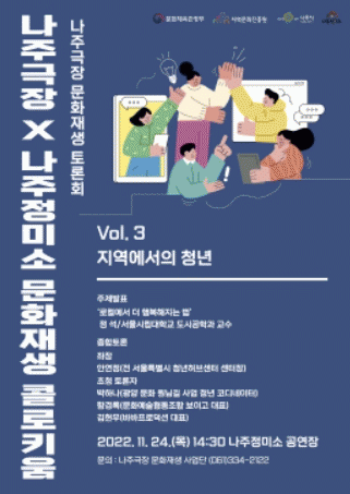 Æ÷·³Àº ¡®³ªÁÖ±ØÀå¡¿³ªÁÖÁ¤¹Ì¼Ò ¹®ÈÀç»ý ÄÝ·ÎŰ¿ò : Vol.3 Áö¿ª¿¡¼ÀÇ Ã»³â¡¯À» ÁÖÁ¦·Î À̳¯ ¿ÀÈÄ 2½Ã 30ºÐºÎÅÍ °³ÃÖµÇ¸ç ¹®ÈÀç»ý¿¡ °ü½ÉÀÌ ÀÖ´Â ½Ã¹Î ´©±¸³ª Âü¿©ÇÒ ¼ö ÀÖ´Ù.