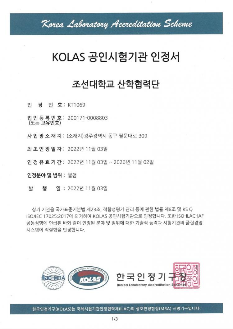À§ ¹üÀ§¿¡ ´ëÇØ Á¶¼±´ë »êÇÐÇù·Â´Ü¿¡¼ ¹ß±ÞÇÑ °øÀμºÀû¼´Â ±¹Á¦½ÃÇè±â°ü ÀÎÁ¤Çù·Âü »óÈ£ÀÎÁ¤ÇùÁ¤(ILAC-MRA)¿¡ °¡ÀÔÇÑ 104°³±¹ 105°³ÀÇ ½ÃÇè±â°ü¿¡¼ ¹ßÇàÇÑ °øÀμºÀû¼¿Í µ¿µîÇÑ È¿·ÂÀ» ÀÎÁ¤¹ÞÀ» ¼ö ÀÖ´Ù.