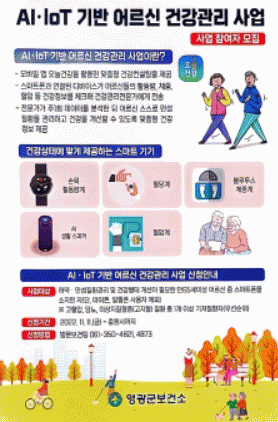 ÇÑÆí, ¿µ±¤±º º¸°Ç¼Ò´Â ½º¸¶Æ®Æù°ú ºí·çÅõ½º ±â±â¸¦ ¿¬µ¿ÇÏ¿© ºñ´ë¸éÀ¸·Î °Ç°°ü¸®¸¦ ½Ç½ÃÇÏ´Â AI-IOT±â¹Ý ¾î¸£½Å °Ç°°ü¸®»ç¾÷À» 2022³â 7¿ùºÎÅÍ ÃßÁøÇϰí ÀÖÀ¸¸ç, 2023³âµµ AI-IOT±â¹Ý¾î¸£½Å °Ç°°ü¸®»ç¾÷ ½Å±Ô ´ë»óÀÚ¸¦ ¸ðÁý ÁßÀÌ´Ï »ç¾÷°ü·Ã »ó´ãÀº ¹æ¹®º¸°ÇÆÀÀ¸·Î ¹®ÀÇ ÇÏ¸é µÈ´Ù.