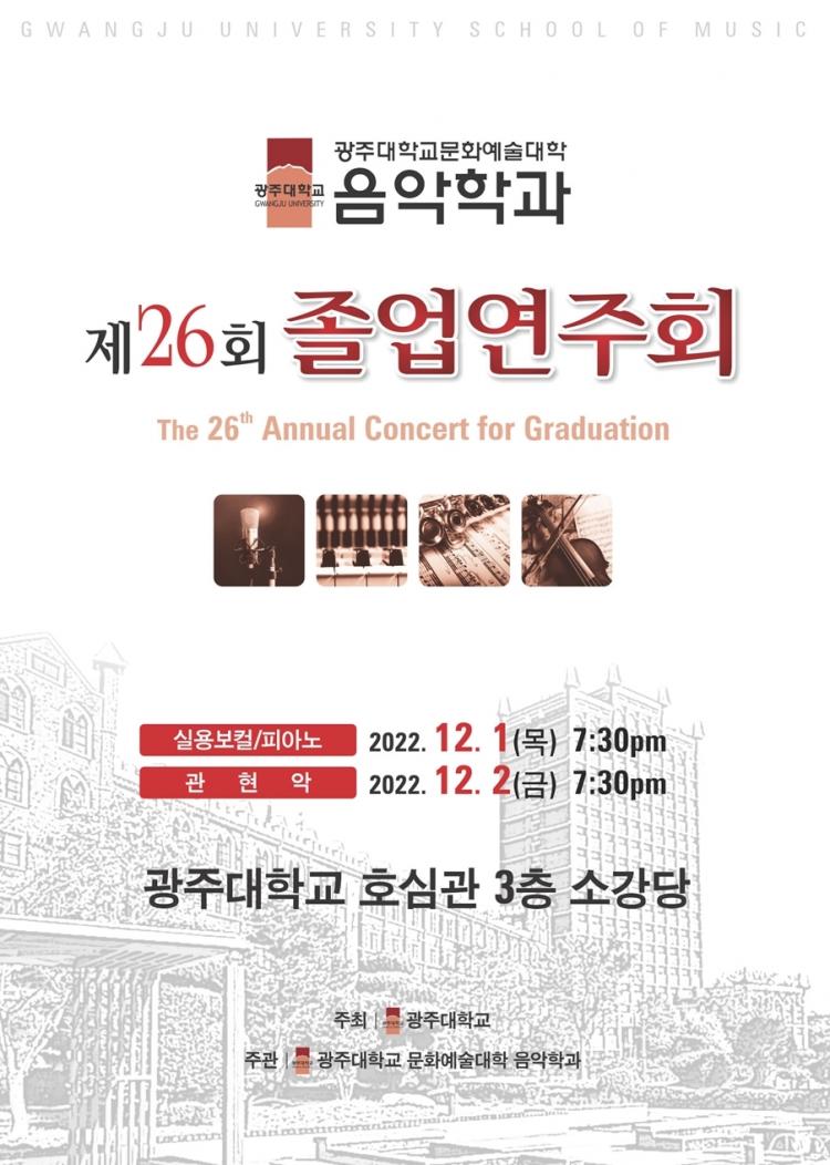 ±¤ÁÖ´ë´Â ³»´Þ 1Àϰú 2ÀÏ ÀÌÆ²°£ Çб³ È£½É°ü 3Ãþ ¼Ò°´ç¿¡¼ À½¾ÇÇаú Á¦26ȸ Á¹¾÷ ¿¬ÁÖȸ°¡ °³Ãֵȴٰí 28ÀÏ ¹àÇû´Ù. À̹ø ¿¬ÁÖȸ´Â ¸ðµÎ ¿ÀÈÄ 7½Ã 30ºÐ¿¡ ½ÃÀ۵ȴÙ.