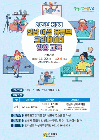 Àü³²µµ´Â 2020³âºÎÅÍ À¯Æ©ºê Å©¸®¿¡ÀÌÅÍ ¾ç¼º°úÁ¤À» ¿î¿µÇϰí ÀÖÀ¸¸ç, Áö±Ý±îÁö 107¸íÀÌ ¼ö·áÇß´Ù. ¿ÃÇØ´Â 1±â(7¿ù ¹«¾È), 2±â(8¿ù ¿©¼ö) ÆòÀÏ °úÁ¤ÀÌ ÁøÇàµÆÀ¸¸ç, À̹ø 3±â´Â ÁÖ¸» °úÁ¤À» »õ·Ó°Ô °³¼³ÇØ Àü³²¿©¼º°¡Á·Àç´Ü¿¡¼ ½Ç½ÃÇÑ´Ù.