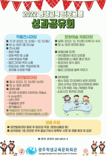 28ÀÏ ±¤ÁÖÇлý±³À°¹®Èȸ°ü¿¡ µû¸£¸é ¼º°ú°øÀ¯È¸´Â ¿À´Â 12¿ù3~10ÀÏ 8ÀÏ µ¿¾È °³ÃÖÇÑ´Ù. ¡ãÀÛǰ Àü½Ã¸¶´ç ¡ã¹®È¿¹¼ú üÇ踶´ç ¡ã°ø¿¬ ¹ßÇ¥¸¶´ç ÃÑ 3°³ÀÇ ºÐ¾ß·Î ¿î¿µÇÒ ¿¹Á¤ÀÌ´Ù.