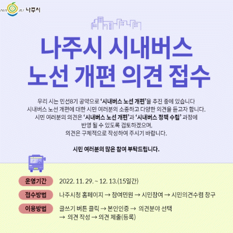 Àü¶ó³²µµ ³ªÁÖ½Ã(½ÃÀå À±º´ÅÂ)´Â 11¿ù 29ÀϺÎÅÍ 12¿ù 13ÀϱîÁö º¸¸§ °£ ½Ãû ´©¸®ÁýÀ» ÅëÇØ ¡®¹Î¼± 8±â ½Ã³»¹ö½º ³ë¼± °³Æí¡¯ °ü·Ã ½Ã¹Î ÀǰßÀ» Á¢¼öÇÑ´Ù°í 28ÀÏ ¹àÇû´Ù.