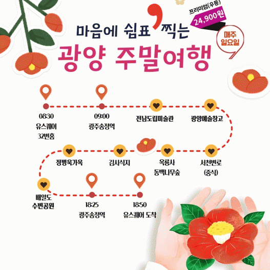±¤¾çÁÖ¸»¿©ÇàÀº ¸ÅÁÖ ÀÏ¿äÀÏ ±¤ÁÖ À¯½ºÄù¾î(8½Ã 30ºÐ)¸¦ Ãâ¹ßÇØ ±¤ÁÖ¼ÛÁ¤¿ª(9½Ã)À» °æÀ¯ÇØ ±¤¾ç ¿øµµ½ÉÀÇ Àü³²µµ¸³¹Ì¼ú°ü, ±¤¾ç¿¹¼úâ°í µîÀ» °ü¶÷ÇÑ´Ù.