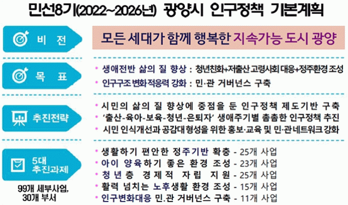 ¡®¹Î¼± 8±â(2022~2026³â) ±¤¾ç½Ã Àα¸Á¤Ã¥ ±âº»°èȹ¡¯Àº ¡®¸ðµç ¼¼´ë°¡ ÇÔ²² ÇູÇÑ Áö¼Ó °¡´ÉÇÑ µµ½Ã ±¤¾ç¡¯À» ºñÀüÀ¸·Î ¡®Ã»³âÄ£È+ÀúÃâ»ê¡¤°í·É»çȸ ´ëÀÀ+Á¤ÁÖȯ°æ Á¶¼ºÀ» ÅëÇÑ »ý¾Ö Àü¹Ý »îÀÇ Áú Çâ»ó¡¯°ú ¡®¹Î¡¤°ü °Å¹ö³Í½º ±¸ÃàÀ» ÅëÇÑ Àα¸±¸Á¶º¯È ÀûÀÀ·Â °È¡¯¸¦ ¸ñÇ¥·Î ÇÑ´Ù.