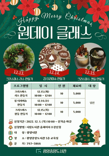 ¡®Å©¸®½º¸¶½º ¿øµ¥ÀÌ Å¬·¡½º¡¯ ÇÁ·Î±×·¥Àº ±¤¾ç½Ã¸³µµ¼°ü ȨÆäÀÌÁö¿¡¼ Á¢¼ö °¡´ÉÇϸç ÀÚ¼¼ÇÑ »çÇ×Àº ±¤¾çÁß¾Óµµ¼°üÀ¸·Î ¹®ÀÇÇÏ¸é ¾Ë ¼ö ÀÖ´Ù.