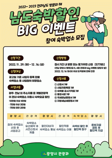 ¡®³²µµ ¼÷¹ÚÇÒÀÎ BIG À̺¥Æ®¡¯´Â ±¤ÁÖ¡¤Àü³² ¿Ü ÁÖ¼ÒÁö¸¦ µÐ °³º°°ü±¤°´ÀÌ Áö¿ª ³» ¼÷¹Ú¾÷¼Ò ÀÌ¿ë ½Ã ¼÷¹Ú ¿ä±ÝÀ» ÇÒÀÎÇØ ÁÖ´Â »ç¾÷À¸·Î, ½Ã´Â ³»³â º½ÃàÁ¦¸¦ °Ü³ÉÇÒ ¹æÄ§ÀÌ´Ù.
